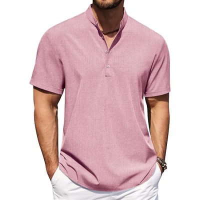 Men's Casual Henley Shirt Short Sleeve Band Collar Shirt Summer Beach Hippie Vacation T Shirt with Button