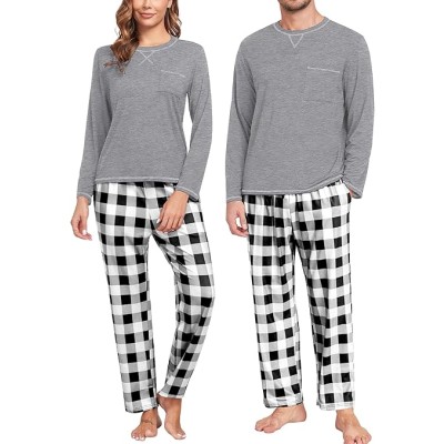 Couples Christmas Pajamas Set Buffalo Plaid Pants with Pockets Womens Mens Long Sleeve Sleepwear for Family