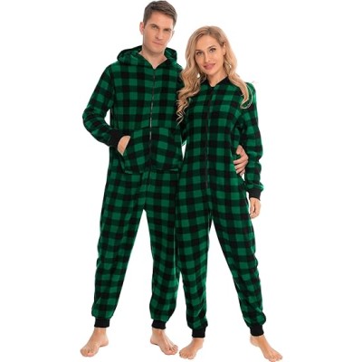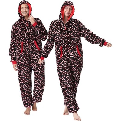 Unisex Flannel Christmas Jumpsuit Soft Sleepwear Adult Couple Matching Family Pajamas Hooded Zip Homewear