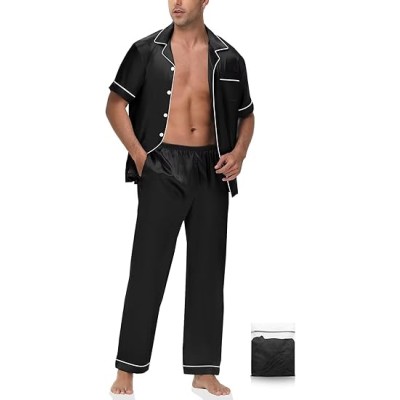 Mens Silk Pajama Set Satin Pjs Short Sleeve Button Down Sleepwear Classic Loungewear Set With Pants S-3XL