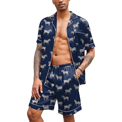 Mens Satin Pajamas Set Button-Down Short Sleeve Shirt Top Soft Silk Sleepwear Loose Pocket Pant Loungewear