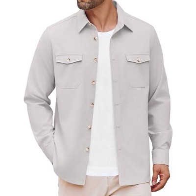 Men's Casual Shirt Jacket Linen Button Down Shirt Long Sleeve Lightweight Shacket with Pockets
