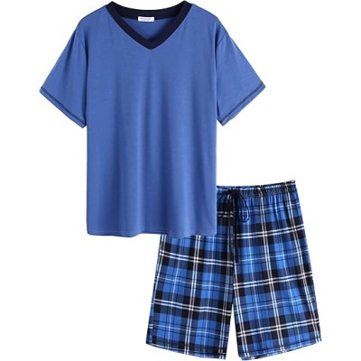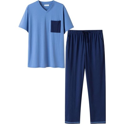 Mens Pajama Set, Soft Cotton V-Neck Short-Sleeve T-Shirt & Pants Summer PJ Set for Sleeping