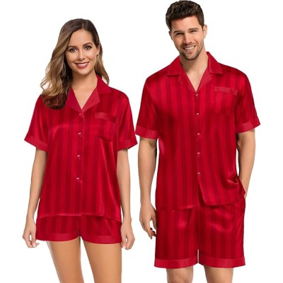Couples Pajama Set Women & Men Silk Satin Short Sleeve Set Top and Shorts Sleepwear Soft Button-Down Loungewear