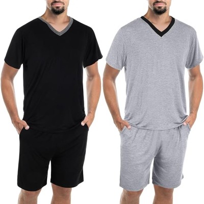 2 Sets Men's V Neck Pajamas Summer Pjs Set Soft Modal Nightwear Short Sleeve and Shorts with Pocket Comfy Sleepwear