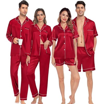 Matching Pajamas Sets for Couples 4 Pcs Silk Satin Pjs Sets Women & Men Button-Down Sleepwear Soft Loungewear