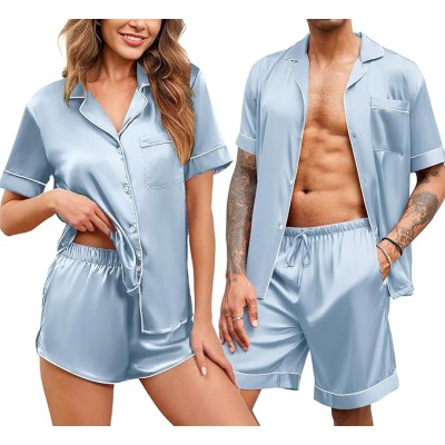 Silk Satin Matching Pajamas Sets Couple Button Down Nightwear Women & Men Short Sleeve Sleepwear 2 Pieces Loungewear