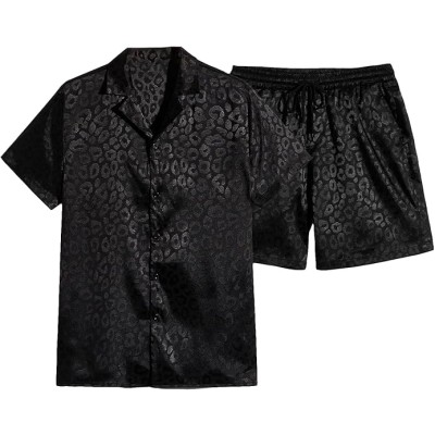 Men's 2 Piece Lounge Set PJ Set Leopard Jacquard Button Front Shirt and Short Sets Black
