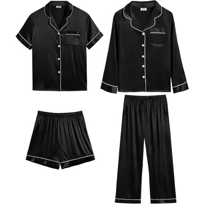 Mens Satin Silk Pajamas Set 3pcs Short Sleeve Sleepwear Silky Button Down Pjs Sets Classic Loungewear Nightwear
